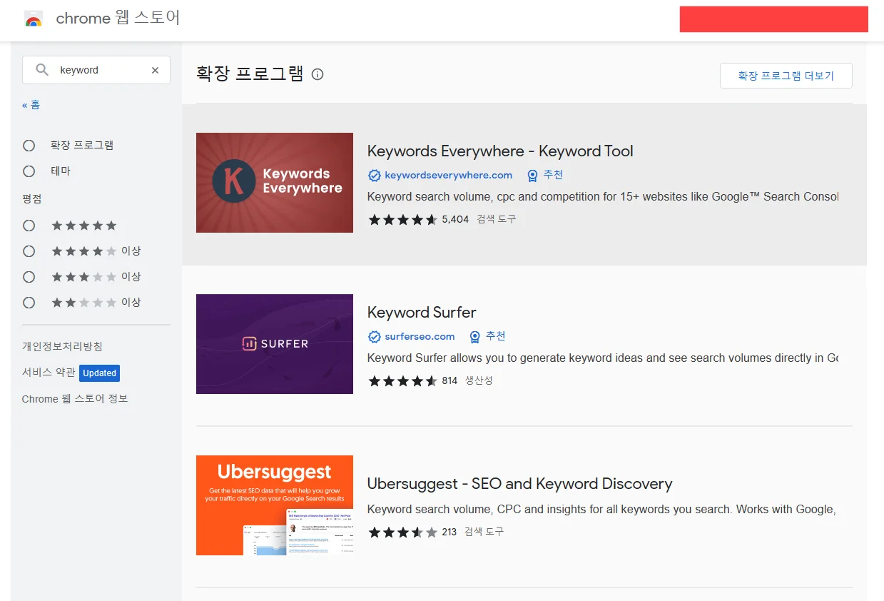 웹스토어에는 다양한 확장 프로그램이 등록되어 있습니다. 여기서 자신이 원하는 프로그램을 찾아 등록하면 됩니다. 예를 들어 키워드에 관련된 확장프로그램이라면 keyword라고 검색해 볼 수 있습니다. 아래 사진은 keyword로 검색한 결과를 보여주고 있습니다.