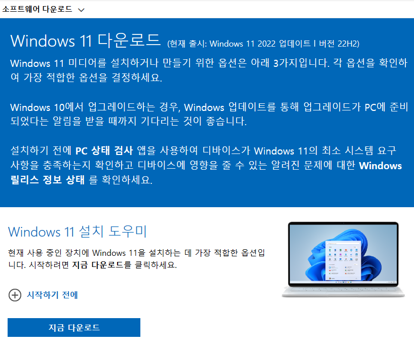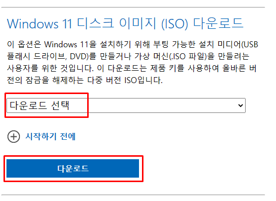 다운로드를 진행하기 전 몇가지를 확인해볼 필요가 있습니다. 2번에서 언급된 사진의 '시작하기 전에'라는 부분을 선택하면 해당 내용을 확인할 수 있습니다. 여기서는 인터넷 연결에 필요한 내용과 windows 11을 설치할 pc에 관련된 내용을 확인할 수 있습니다. 한번쯤은 보시는 것을 추천합니다.