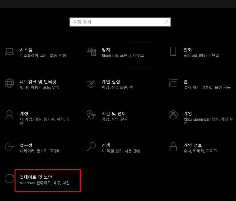 윈도우 설정기능을 활성화 합니다. 위 사진을 참고하시면 되겠죠. '업데이트 및 보안'기능을 선택합니다.
