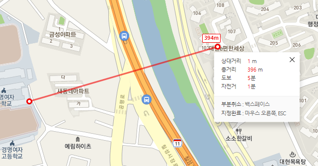 b. 지점을 선택합니다. 거리재기를 선택한 상황에서 지도에 표시된 지점을 선택합니다. 먼저 선택한 지점을 중심으로 마우스가 이동할 때마다 정보를 표시해 주게 됩니다. 사진을 참고해 주세요.