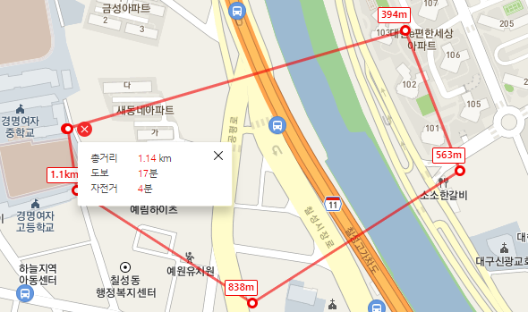 c. 최종 지점 선택하여 확인합니다. 첫번째 지점을 선택하면 지도상의 팝업메시지를 통해 상대거리, 총거리, 도보, 자전거등의 정보를 확인할 수 있습니다. 최종적으로 두번째 지점을 선택하면 아래 사진과 같이 정보를 얻을 수 있습니다.